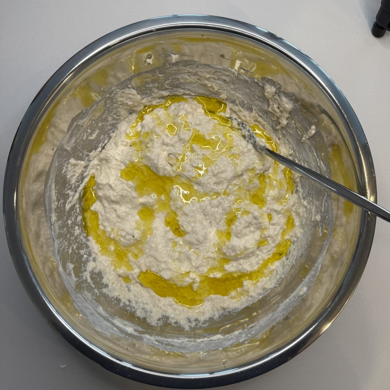 Add the water and use a fork to roughly mix the dough. It will be soggy and that is normal. Drizzle the olive oil on top.