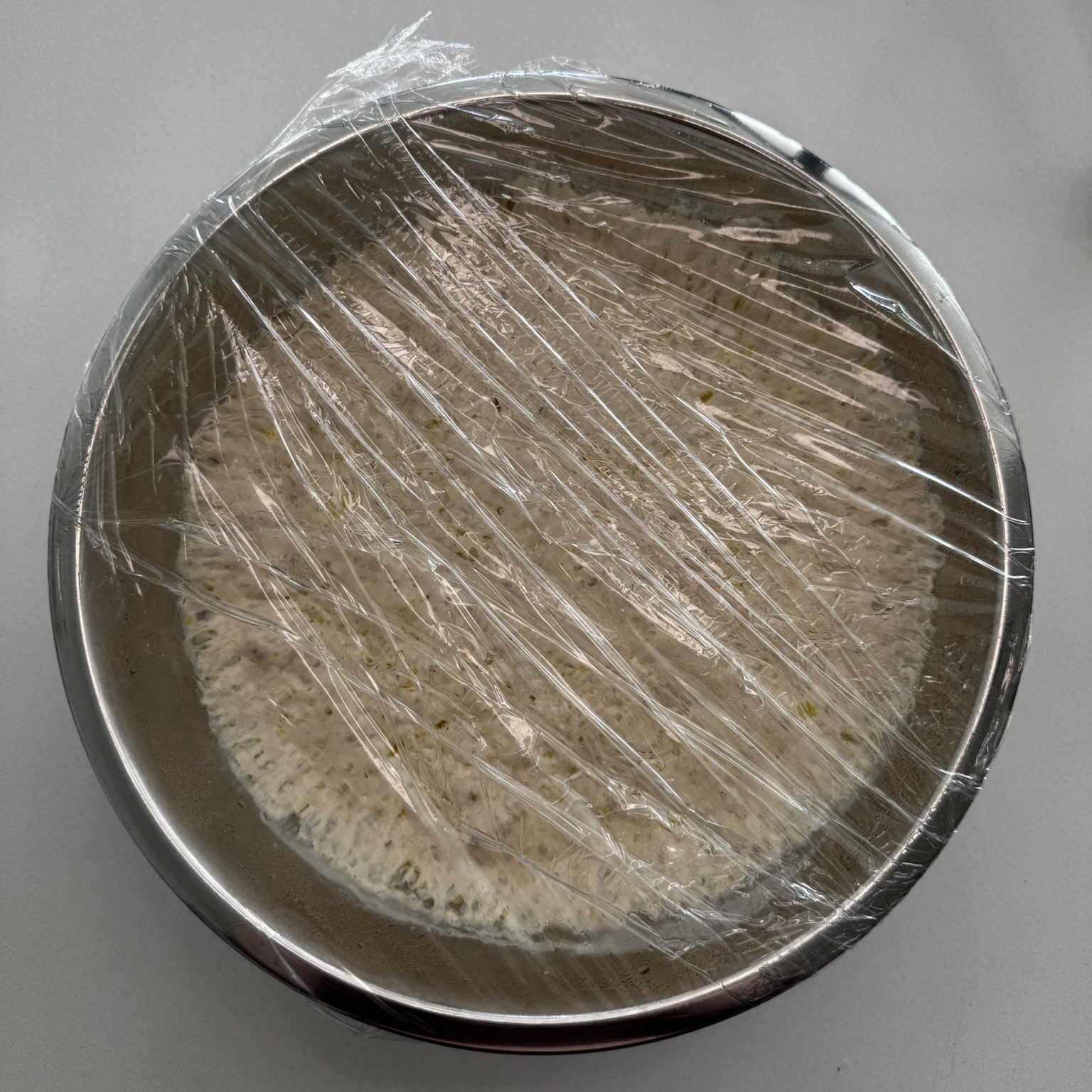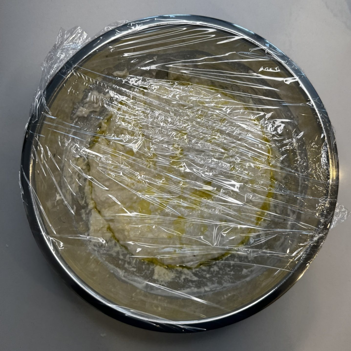 Cover with a plastic wrap and leave the dough at room temperature until it doubled in size. Around 6 to 8 hours.