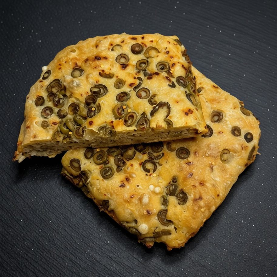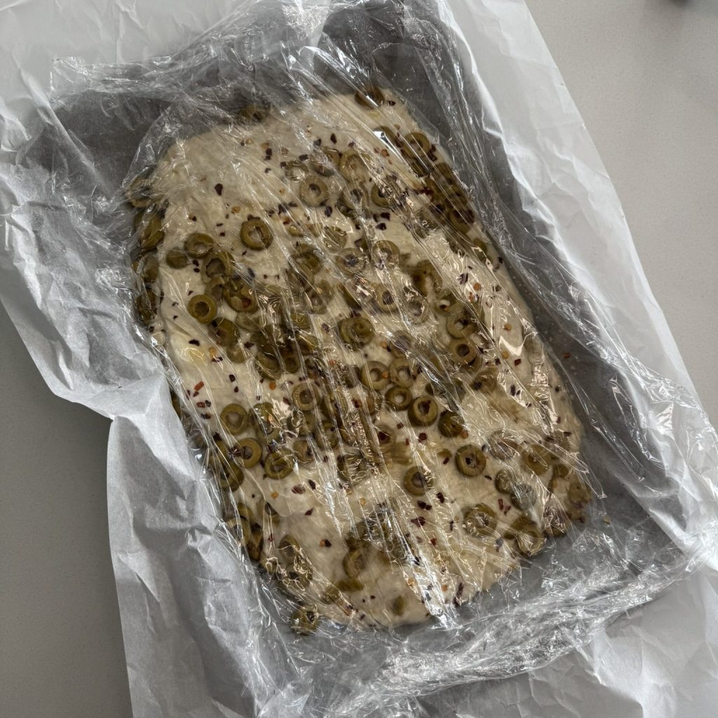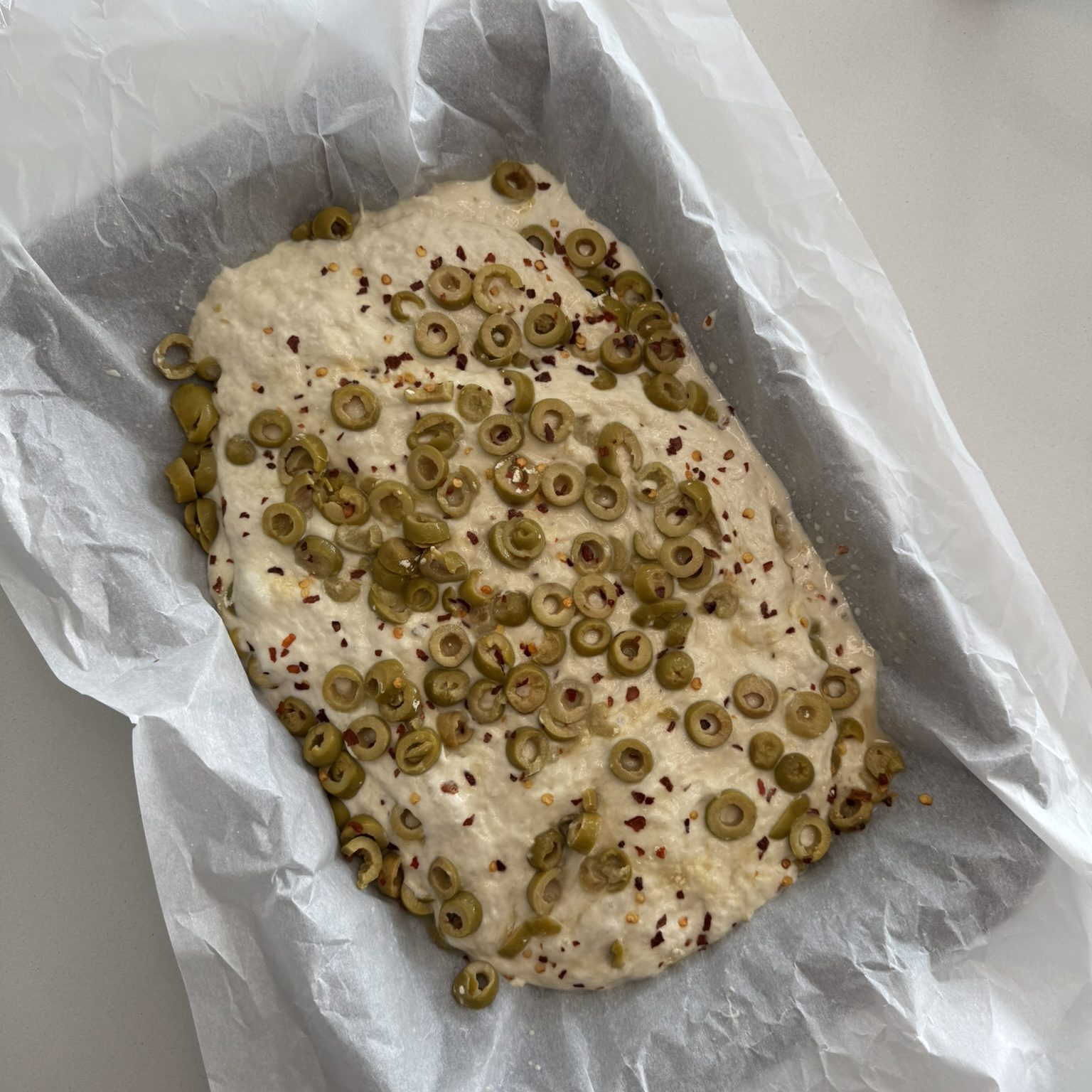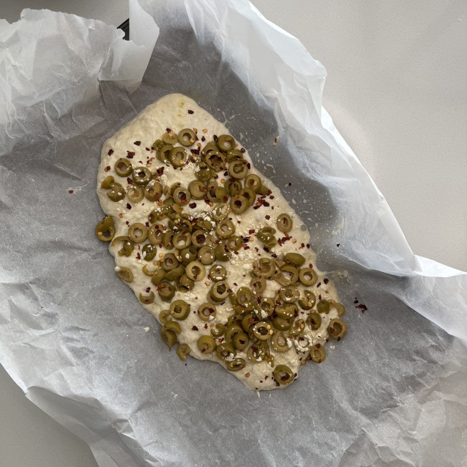 When you are ready, use a baking pan and add half of the dough to make a first layer. Add the toppings of your choice, in my case, olives, garlic powder and chili flakes. Add the other half of the dough and repeat with the toppings.